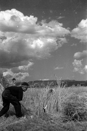 - Un segador agafa un feix d'espigues per fer una garba.