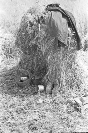 - El cistell amb menjar, un pot, sabates i roba d'un segador, posat en una garba.